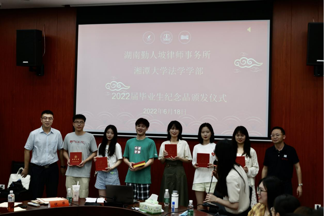 2022年6月18日,湖南勤人坡律师事务所杨斯昂主任来到bevictor伟德官网法学楼,与法学院党委黎益君副书记一起为bevictor伟德官网2018级本科毕业生代表现场颁发了毕业生纪念品。