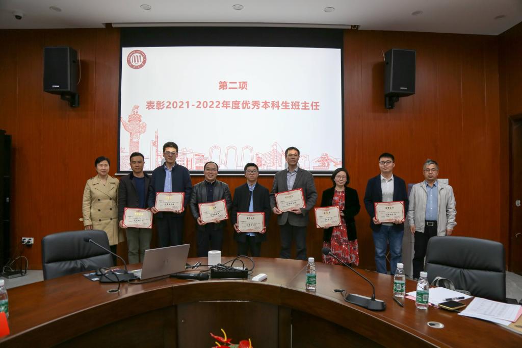 会议表彰了2021-2022年度优秀本科生班主任,欧爱民院长、易立峰书记为谭达宗、肖伟志、刘功奇、穆远征、吴秀文、夏先华、田良富等七位优秀班主任老师颁发了荣誉证书。