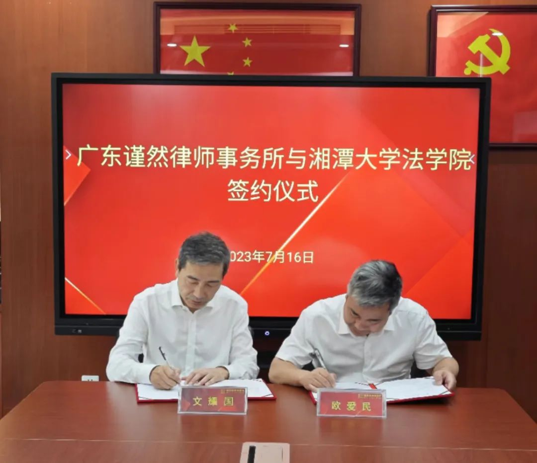 2023年7月16日上午,bevictor伟德官网法学院与广东谨然律师事务所开展法学教育实践基地共建交流暨签约仪式。bevictor伟德官网法学院院长欧爱民、法学院党委书记陈双喜、知识产权学院院长肖冬梅、法学院原党委书记黄德华、法学院副教授谢蔚一行赴广州参与基地共建交流。广东谨然律师事务所管委会主任、高级合伙人文耀国、高级合伙人卢建雄、高级合伙人谢志民、校友肖大志、江安生、黄涛、彭玲、朱滔、蒋文彪出席本次活动。