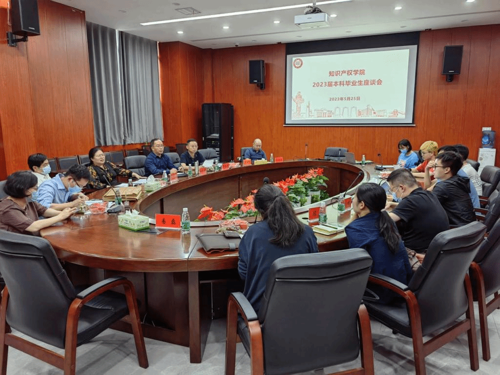 2023年5月25日下午,知识产权学院2023届本科生毕业生座谈会在法学楼东附一楼会议室召开。知识产权学院院长肖冬梅、书记田良富、技术转移中心主任刘友华、法学院副书记黎益君、2012届院友朱飞叶等出席,参加座谈会的还有学院部分教师代表、2023届本科毕业生。会议由田良富主持。