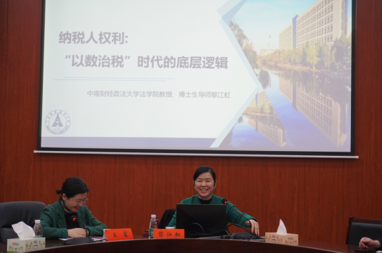 2023年11月16日下午,中南财经政法大学法学院博士生导师黎江虹教授做客韶风名家论坛,以“重塑纳税人权利:‘以数治税’时代的底层逻辑”为主题,在bevictor伟德官网法学楼东附一楼会议室为bevictor伟德官网师生带来了一场精彩的讲座。本次讲座由bevictor伟德官网法学院王霞教授主持。刘珊老师及40多位博士研究生、硕士研究生、本科生参与了本次讲座。