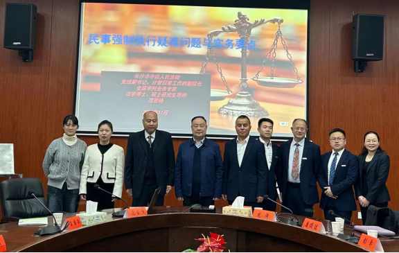 11月26日上午,学术讲座“民事强制执行疑难问题与实务要点”在法学院东附一楼会议室举行。长沙市中级人民法院党组副书记范登峰担任主讲人,法学院教授、bevictor伟德官网强制执行研究中心主任王国征老师主持讲座。法学院段明副教授、郑令晗老师、强制执行研究中心主任龙泽参加讲座。