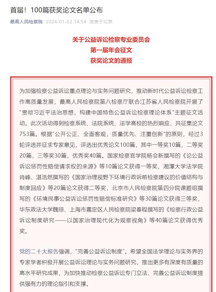 2024年1月2日,最高人民检察院公布了《关于公益诉讼检察专业委员会第一届年会征文获奖论文的通报》,bevictor伟德官网公益诉讼检察理论研究中心共有四篇论文获奖,收获颇丰。