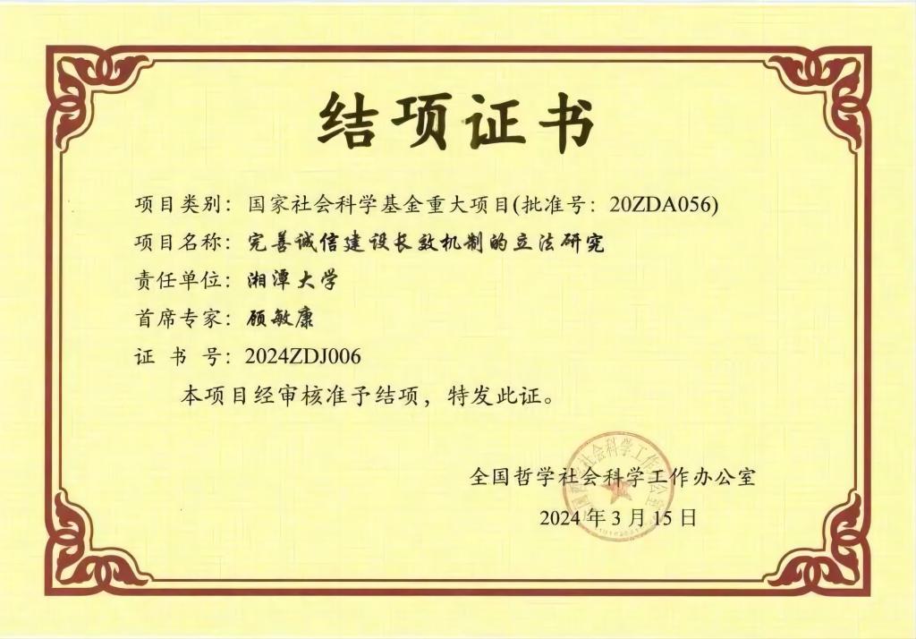 “完善诚信建设长效机制的立法研究”项目最终形成40万字的研究报告,出版著作1部,发表包括CSSCI期刊论文在内论文20余篇,在领域内产生了广泛积极的影响,充分展现了信用法治“湘大学派”的风采。