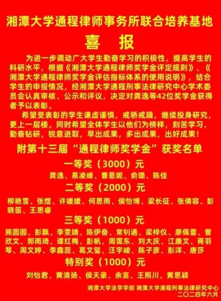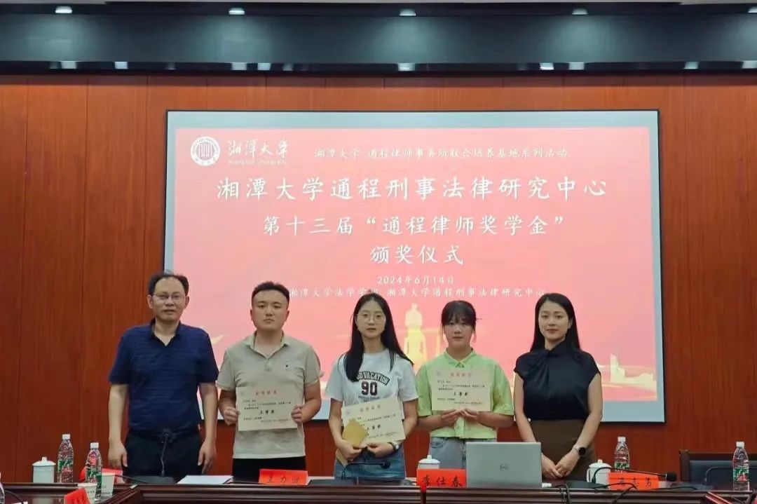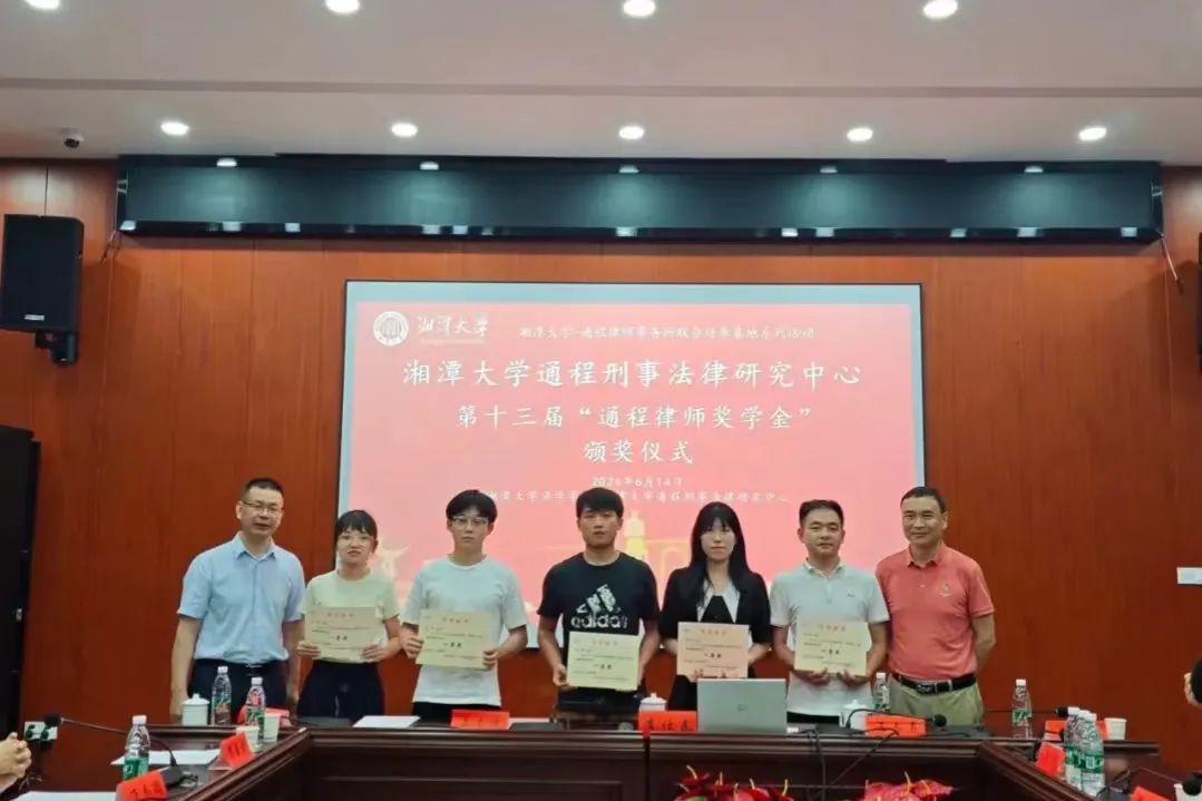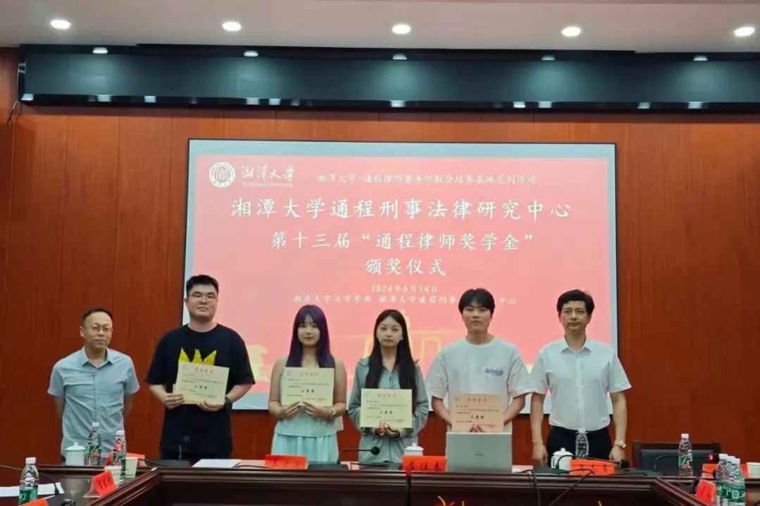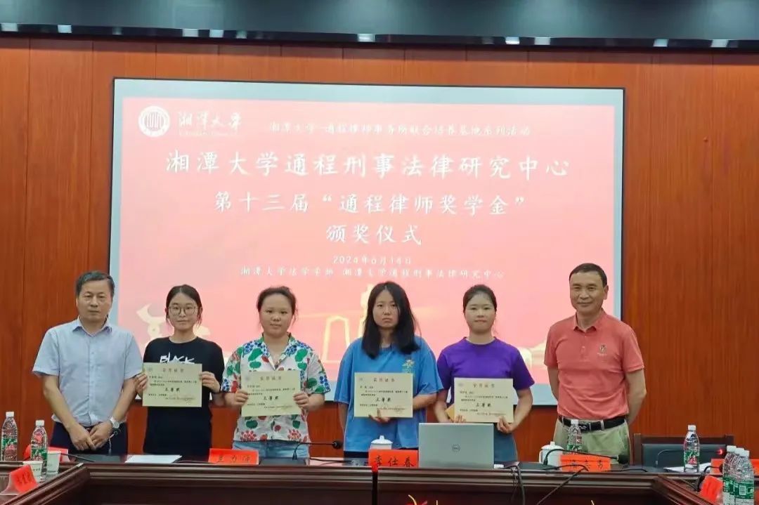 2024年6月14日下午,bevictor伟德官网-通程律师事务所研究生联合培养基地系列活动—bevictor伟德官网通程刑事法律研究中心第十三届“通程律师奖学金”颁奖仪式在bevictor伟德官网,伟德国际1946东附一楼会议室举行。颁奖仪式由bevictor伟德官网-通程律师事务所研究生联合培养基地执行主任、bevictor伟德官网通程刑事法律研究中心主任、湖南省刑事法治研究会会长、bevictor伟德官网,伟德国际1946博士生导师黄明儒教授主持,bevictor伟德官网,伟德国际1946部长、博士生导师李仕春教授,bevictor伟德官网,伟德国际1946书记陈双喜,联合培养基地主任、研究中心执行主任、研究会副会长、通程律师事务所主任兰力波律师,通程律师事务所名誉主任潘志勇律师,研究会副秘书长、通程律师事务所副主任、刑事事务部部长肖晗律师,通程律师事务所裴一霖律师、陈金磊律师,研究中心副主任、研究会学术秘书长、bevictor伟德官网,伟德国际1946张永江副教授,以及bevictor伟德官网,伟德国际1946万志鹏教授、王奎副教授、李兰老师等参加了本次颁奖仪式。