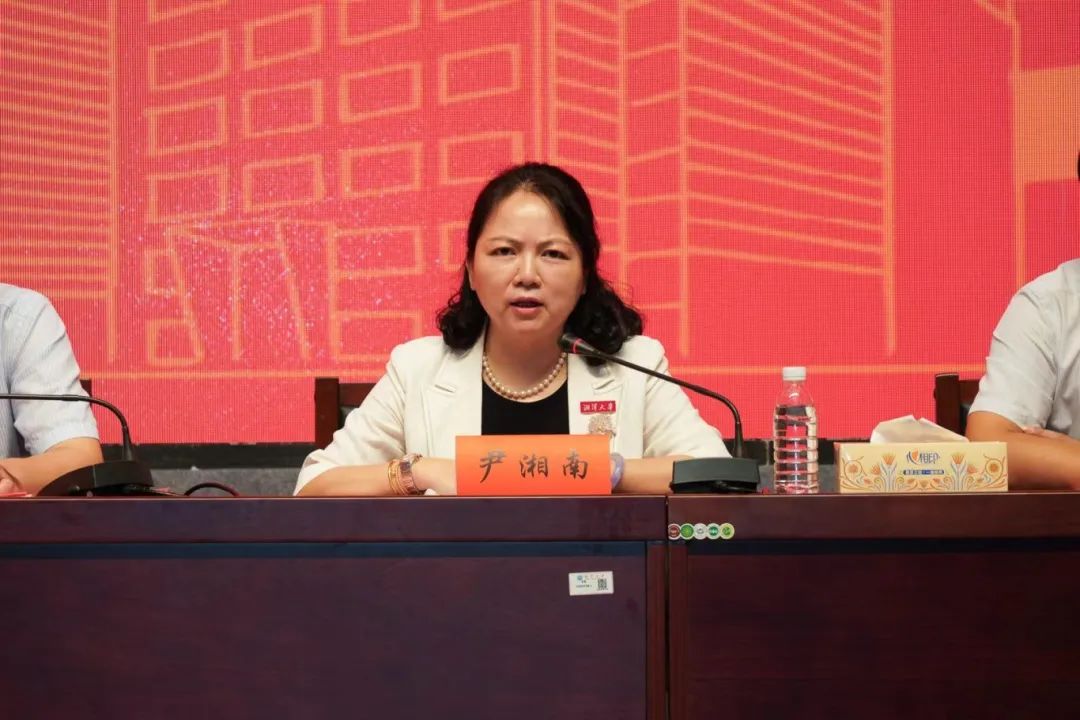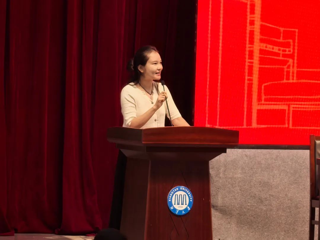尹湘南院友在发言中表达了对湘大法学的感恩之情。她提出,时代潮流中,奋斗是青春最靓丽的底色,并结合自身成长的故事,激励新生不懈奋斗,梦圆湘大。