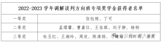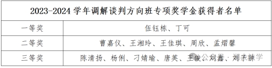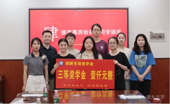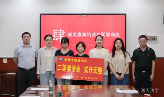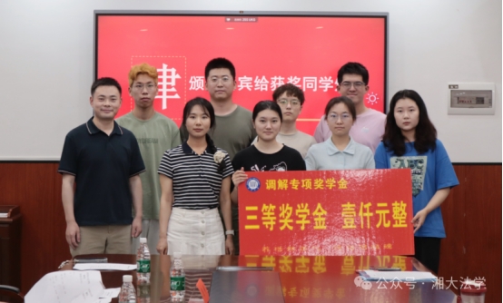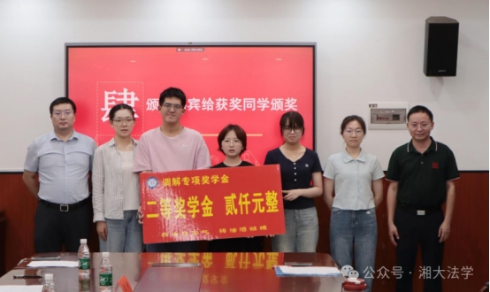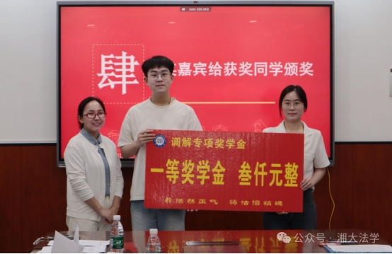 随后,黎益君副书记宣读了2022-2023、2023-2024学年调解奖学金获奖名单。李喜莲副部长为荣获一等奖的同学颁奖;连光阳副部长与黎益君副书记为获得二等奖的同学颁奖;段明老师、龙乙方老师为获得三等奖的同学颁奖。