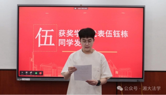 获奖学生代表伍钰栋同学结合自身的学习经历发表感言。他表示,调解班多元的课程设计和丰富的实践活动使其获益良多,如今这份荣誉既是激励更是责任,未来将继续提升自身的专业素养、保持热忱之心,以“知行合一”的态度为法治建设贡献力量。发言最后,伍钰栋同学向学部和老师们表示由衷的感谢,也为同学们送上了真诚的祝福。