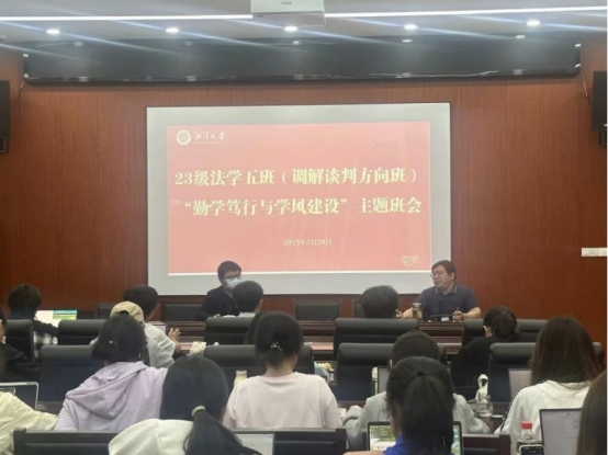 2025年5月28日晚上7点半,2023级法学五班(调解谈判方向班)在永雄楼东附一楼会议室召开了以“勤学笃行与学风建设”为主题的班会。班主任李仕春老师和副班主任夏先华老师出席,法学五班全体同学参加。