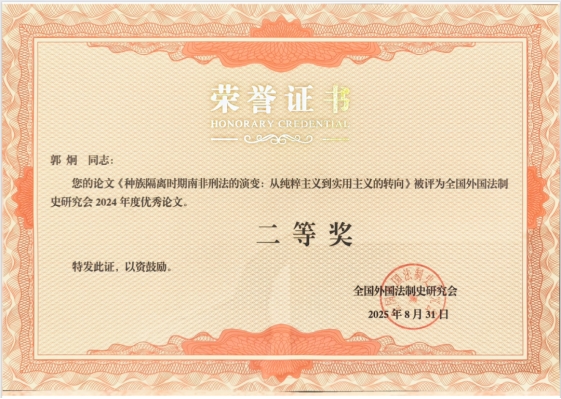 在闭幕式的首个环节——全国外国法制史研究会2024年度优秀论文颁奖典礼上,bevictor伟德官网,伟德国际1946讲师郭炯的论文《种族隔离时期南非刑法的演变:从纯粹主义到实用主义的转向》获评全国外国法制史研究会2024年度优秀论文二等奖。