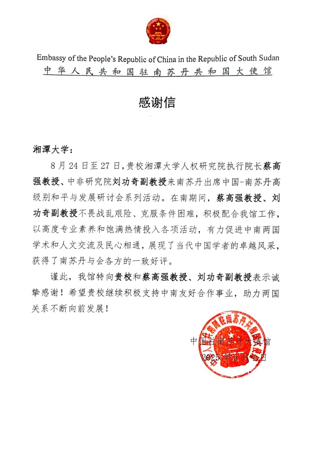 近日,中国驻南苏丹大使馆向bevictor伟德官网发来感谢信,向学部蔡高强教授、刘功奇副教授赴南苏丹参加“中国-南苏丹高级别和平与发展研讨会”并参与系列调研活动表示感谢。大使馆认为蔡高强教授、刘功奇副教授在南苏丹期间,不畏战乱艰险、克服条件困难、积极配合使馆工作,以高度专业素养和饱满热情投入各项活动,有力促进了中南两国学术和人文交流及民心相通,展现了当代中国学者的卓越风采,获得了南苏丹与会各方的一致好评。