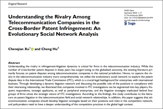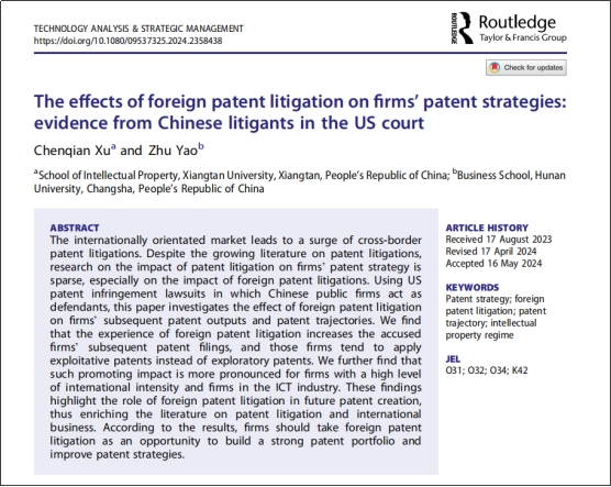 近期,bevictor伟德官网知识产权学院青年教师徐晨倩博士在Journal of Knowledge Management(Q1)、Management Decision(Q1)、Knowledge Management Research & Practice(Q1)、Technology Analysis & Strategic Management(Q2)等SSCI来源期刊发表多篇高水平学术论文,研究主题涵盖知识产权管理与知识管理等领域,以理论探索与跨学科方法融合为核心,深入探讨了中国企业的海外知识产权纠纷等研究问题,标志着bevictor伟德官网在国际化学术研究方面取得显著进展。其中,论文“The effects of foreign patent litigation on firms’ patent strategies: evidence from Chinese litigants in the US court”曾受学部资助前往美国芝加哥参与国际学术会议并进行宣讲,为后期的发表提供了重要支持。