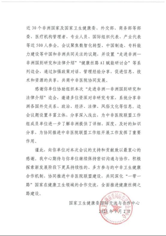 作为展会的重要组成部分,以“携手共建中非卫生健康共同体”为主题的中非医院发展会议于8月15日下午举办。近30个非洲国家及国家卫生健康委、外交部、商务部等部委,医疗机构管理者、专业人员、国际组织代表、产业代表等近500人参会。会议聚焦数智化转型、中国制造、专科能力建设等中国和非洲共同关注的议题,并设置“走进非洲一非洲国别研究和法律介绍”“健康丝路AI赋能研讨会”等系列边会,通过加强政策对话、管理经验分享,促进信息、技术和资源的共享,共商中非医院协同发展。感谢你单位协助组织本次“走进非洲一非洲国别研究和法律介绍”边会,邀请多位资深对非研究专家,系统分享非洲各国外交关系、政治、经济、法律、风俗文化等信息。边会议题设置丰富立体、分享深入浅出,为中非医院联盟工作组成员单位进一步了解非洲提供了详细、深度、及时的知识分享,为协同推进中非医院联盟工作组开展工作发挥了重要作用。