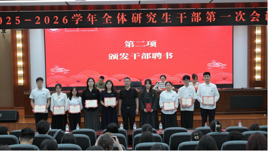 在聘任仪式环节,陈双喜书记为新任团总支、研究生会主席团成员及党务助理等研究生干部代表颁发聘书。
