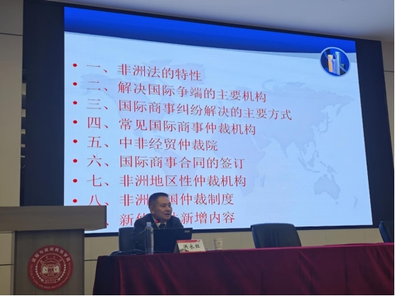 洪永红教授系统围绕非洲法特性与涉外(非洲)仲裁两大核心板块展开授课。在非洲法特性部分,洪永红教授既深入剖析其渊源多样性、法律意识混合性、与中国法的可比性及内容开放性等独特属性,也梳理了从公元前3500-4000年埃及法到非洲独立后非洲法律演变的完整历史脉络;在涉外(非洲)仲裁部分,洪永红教授首先全面梳理国际争端主要解决机构、国际商事纠纷解决方式及常见国际商事仲裁机构的实践要点,随后重点聚焦2024年成立的中非经贸仲裁院——详解其四类管辖案件、中非联合仲裁机制、多语言服务及网络仲裁规则等专属解决方案,同时结合2025年仲裁法在在线仲裁、涉外仲裁特别规定等方面的最新修订动态,为涉非经贸活动提供了从法律认知到纠纷解决的完整知识框架,兼具理论深度与实践指导价值。