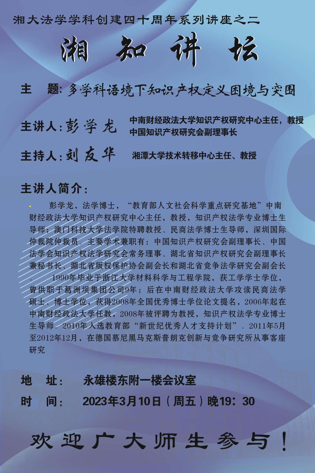 【湘大法学学科创建四十周年系列讲座之二】彭学龙:多学科语境下知识产权定义困境与突围
