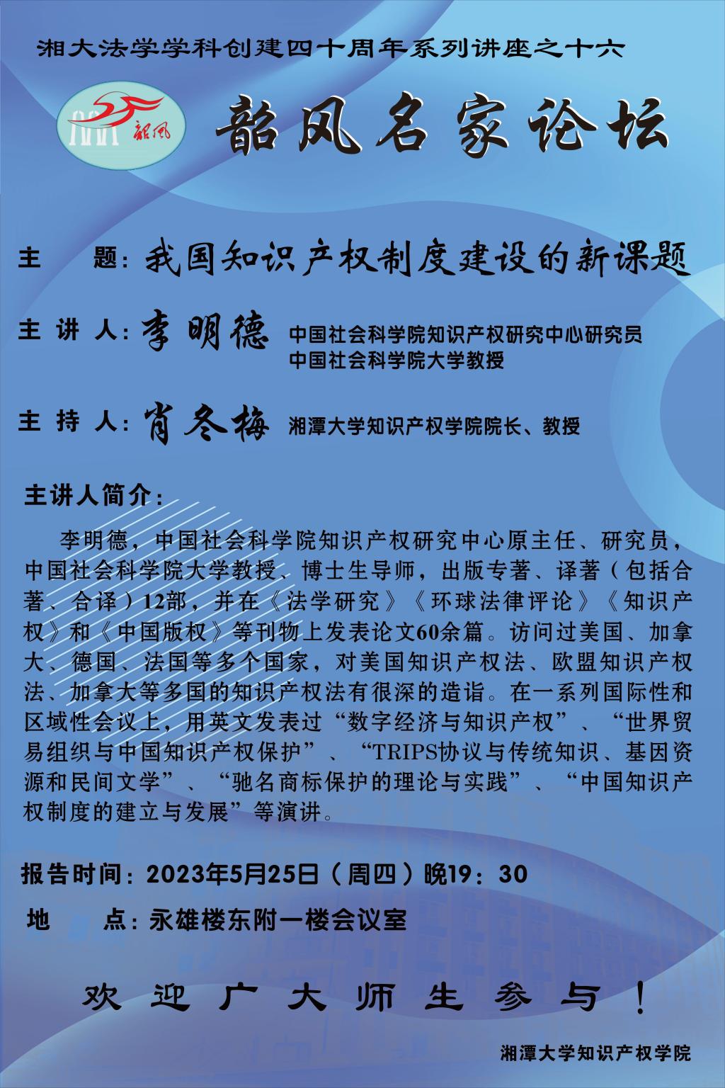 【湘大法学学科创建四十周年系列讲座之十六】李明德:我国知识产权制度建设的新课题