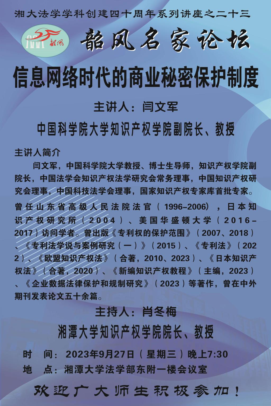 【湘大法学学科创建四十周年系列讲座之二十三】闫文军:信息网络时代的商业秘密保护制度