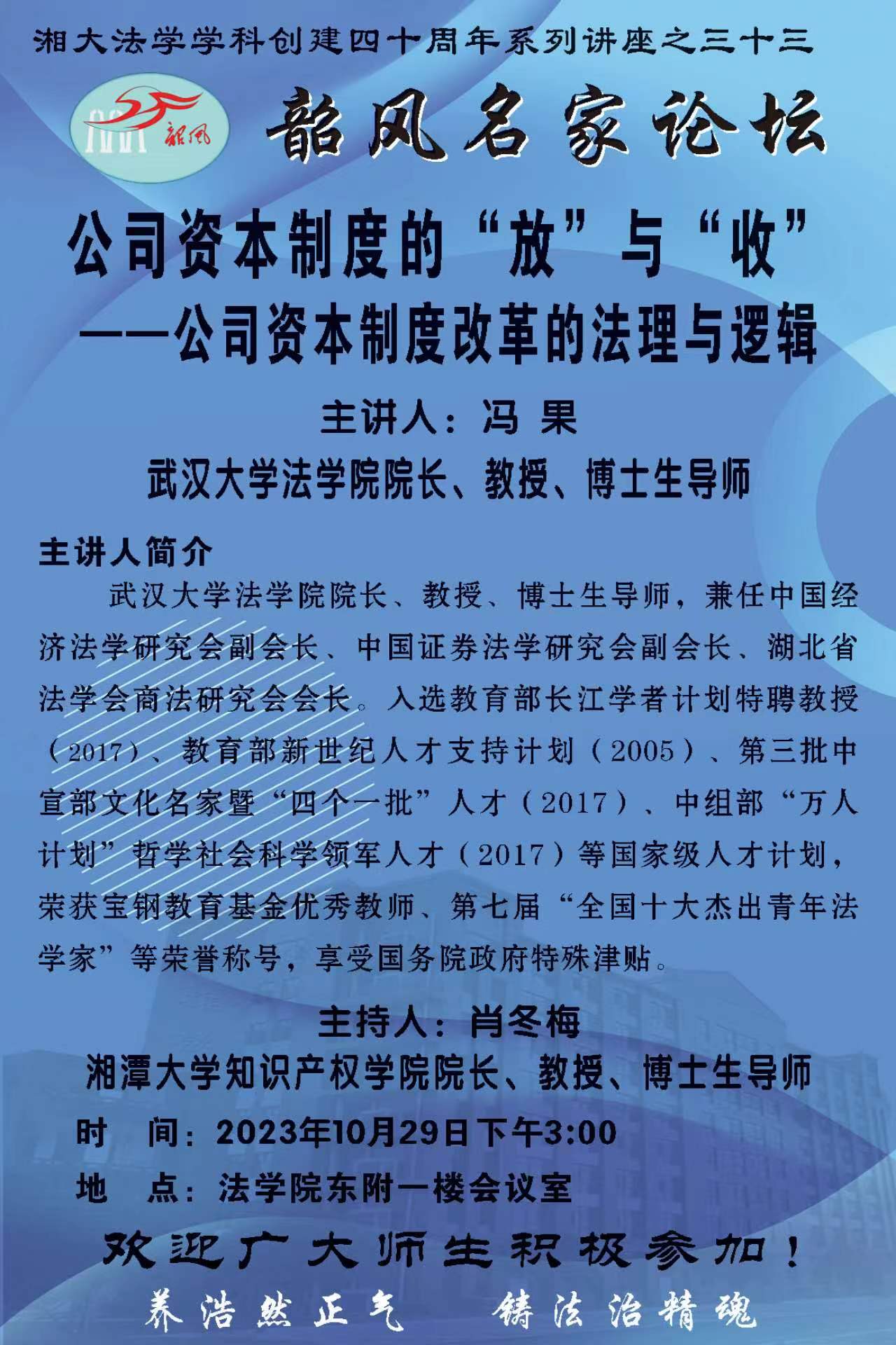 【湘大法学学科创建四十周年系列讲座之三十三】冯果:公司资本制度的“放”与“收”一一公司资本制度改革的法理与逻辑