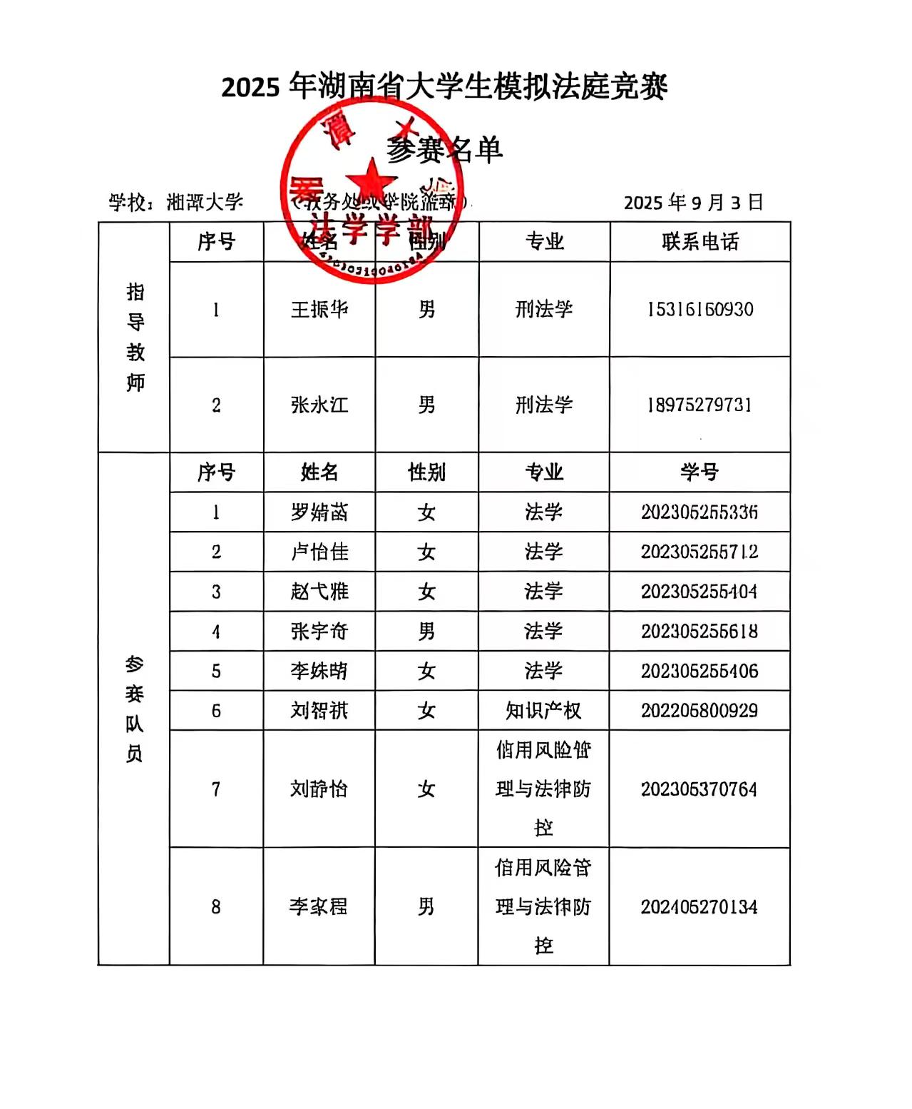 综合bevictor伟德官网模拟法庭暑期训练赛以及选拔赛的现场表现情况,并报bevictor伟德官网,伟德国际1946学科竞赛办公室批准,以下同学为2025年湖南省大学生模拟法庭竞赛bevictor伟德官网代表队成员: