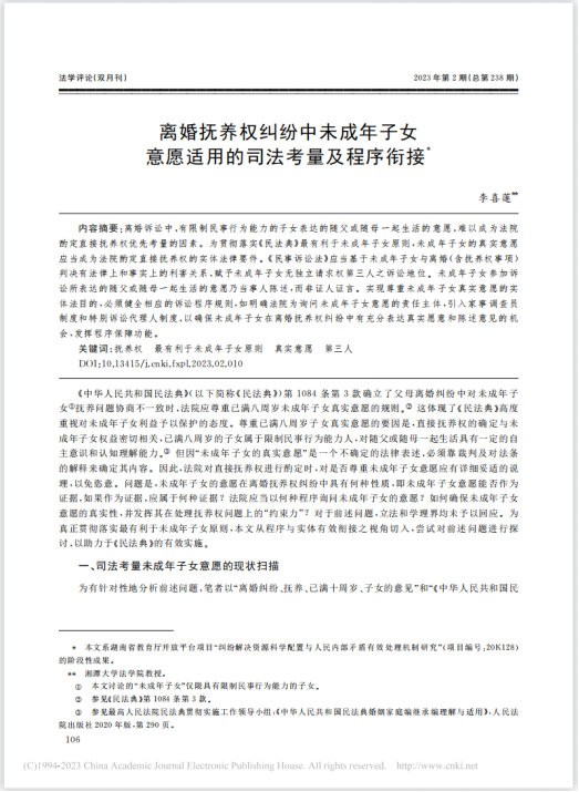 我院李喜莲教授的论文《离婚抚养权纠纷中未成年子女意愿适用的司法考量及程序衔接》刊发于法学核心期刊《法学评论》(CLSCI)202