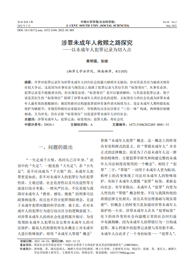 我院黄明儒教授和硕士研究生张继合著论文《涉罪未成年人救赎之路探究
