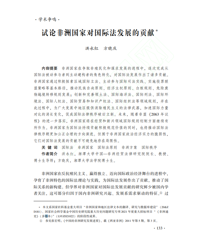 我院洪永红教授和博士生方晓庆合著论文《试论非洲国家对国际法发展的贡献》刊发于