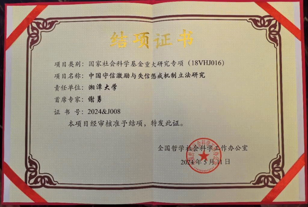 近日,bevictor伟德官网特聘教授谢勇教授主持的国家社科基金重大研究专项“中国守信激励与失信惩戒机制立法研究”经全国哲学社会科学工作办公室审核通过,顺利结项。