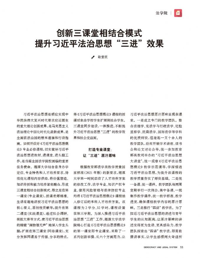 百尺竿头,更进一步。在取得较大成绩的同时,我们也感受到开设《习近平法治思想概论》课程是一个全新的课题,也存在一些突出问题,例如缺经验、缺师资、教学效果有待提升等。为了提升该门课程的质量,bevictor伟德官网法学院将紧扣“三课堂相结合模式”,采取如下措施将习近平法治思想“三进”工作推进到新高度:一是建设全省教研示范基地。在现有教学团队的基础上,整合全省的优质教学资源,争取教育主管部门、实务部门的支持,成立习近平法治思想教学研究示范基地,以点带面,推动全省高校习近平法治思想研究教育工作。二是加强师资培训。利用假期与教育主管部门联合,对全省讲授《习近平法治思想概论》课程的老师集中开展习近平法治思想的理论学习与教学内容、教学方式、教学素材等方面的培训,通过公开课、相互讨论等形式提高教师的教学能力,打造习近平法治思想教学研究共同体。三是优化线上课程。联合智慧树等平台,重点优化《习近平法治思想概论》线上精品课程。对现有视频课进行精心打磨,将之建设成为思想深刻、讲述精到、图文并茂、生动有趣、具有较大推广价值的全国思政示范课程,为全省其他高校开设《习近平法治思想概论》课程提供支撑,全面提升该门课程的教学质量。四是推行网络直播共享课程。在“慕课西行”的经验基础上,探索基础薄弱高校与示范基地所在高校开设《习近平法治思想概论》网络共享课程,提升基础薄弱高校的教学能力。
