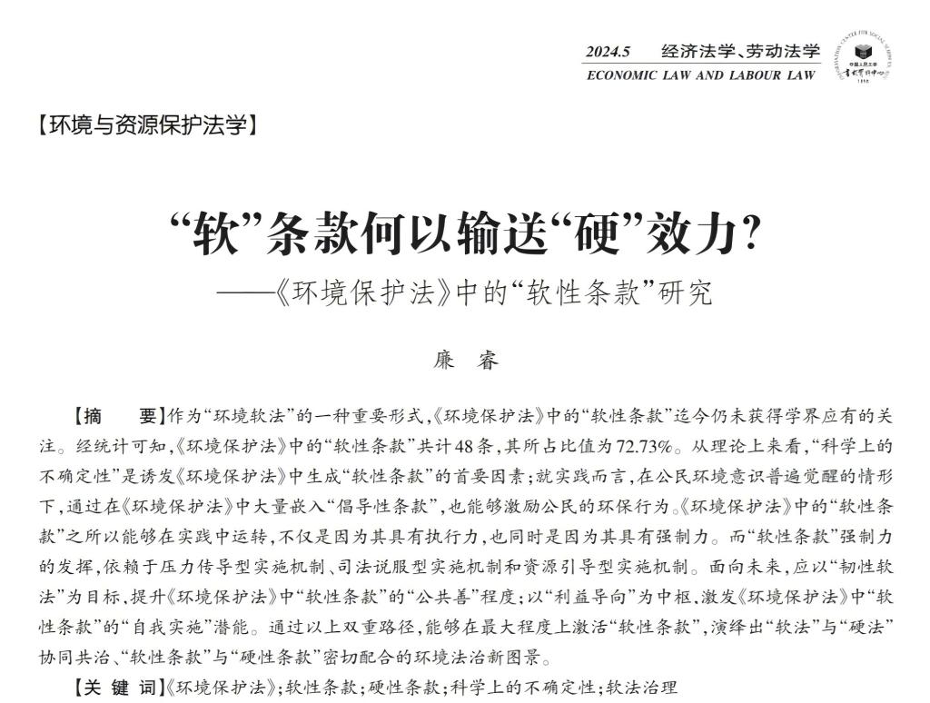 bevictor伟德官网,伟德国际1946廉睿副教授的论文《“软”条款何以输送“硬”效力?——<环境保护法>中的“软性条款”研究》被人大复印报刊资料《经济法学、劳动法学》2024年第5期全文转载。