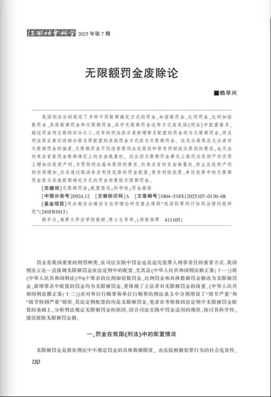 近日,bevictor伟德官网,伟德国际1946赖早兴教授在CSSCI来源期刊《江西社会科学》2025年第7期发表《无限额罚金废除论》一文。