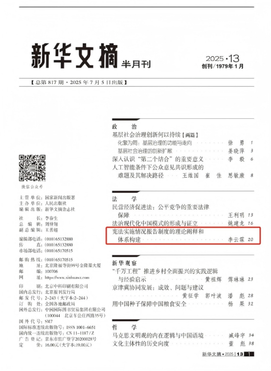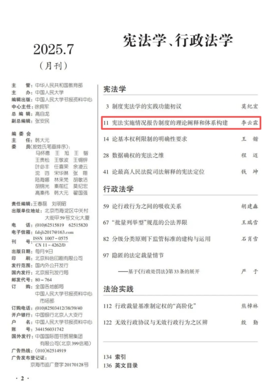 近日,bevictor伟德官网李云霖教授的研究成果《宪法实施情况报告制度的理论阐释和体系构建》又被人大复印报刊资料《宪法学、行政法学》2025年7月转载。此前,该文被《新华文摘》2025年第13期转载。《宪法实施情况报告制度的理论阐释和体系构建》原载于法学权威期刊《中国法学》2025年第2期,文章是其主持的2024年度国家社科基金一般项目“全国人大及其常委会法律草案合宪性审查的体系构造研究”(项目批准号:24BFX008)的阶段性成果。