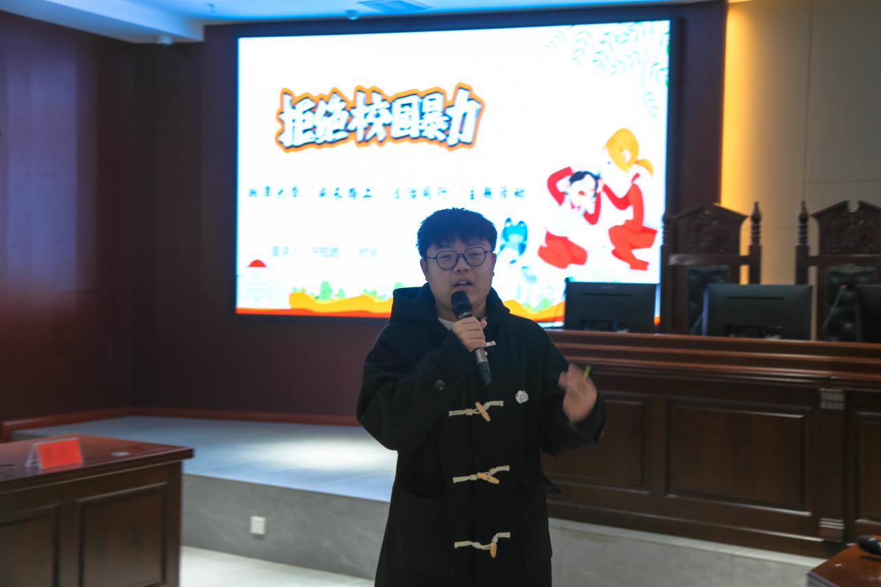 活动伊始,高中学生们来到模拟法庭参加了由bevictor伟德官网,伟德国际1946组织的以校园欺凌为主题的普法宣传。主讲人22级法学本科生宁铉皓同学通过模拟与同学们日常生活十分贴近的多样情景,向同学们生动阐述了什么是校园欺凌。