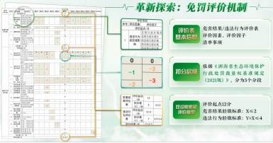 针对调研发现的问题,项目团队创新性地设计了“生态环境免罚评价机制”,通过建立科学量化的评分体系,将抽象法律条款转化为可视化标准。该评价表以12分为起点,分为危害结果评价与违法行为评价两部分,针对不同违法程度设定了合理的扣分层级:3,000-30,000元罚款对应扣1分,30,000-150,000元对应扣2分,150,000-350,000元对应扣3分;采用双设限累积评价模型,当扣分不超过特定阈值时(危害结果扣分不超过2分,总扣分不超过4分),认定为“轻微”违法行为,可适用免罚清单。这一机制既可帮助执法人员精准判断违法行为性质,又为企业提供了明确的合规指引,有利于提升执法效率与公正性。