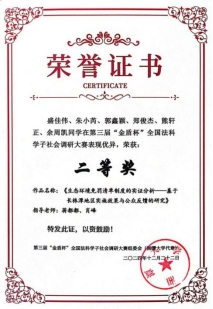 该项目凭借其扎实的调研数据和创新性解决方案,在全国性竞赛中崭露头角,先后获得第四届“从法杯”全国大学生“法治中国”调研大赛三等奖、第三届“金盾杯”全国法科学子社会调研大赛二等奖荣誉。此外,团队提出的免罚评价表建议已得到湖南省永州市东安县环保局的积极回应,相关优化措施会结合实际执法工作和后续的调研工作逐步推进。这些成果充分证明了本研究在理论与实践层面的双重价值,为生态环境执法改革提供了有益借鉴。