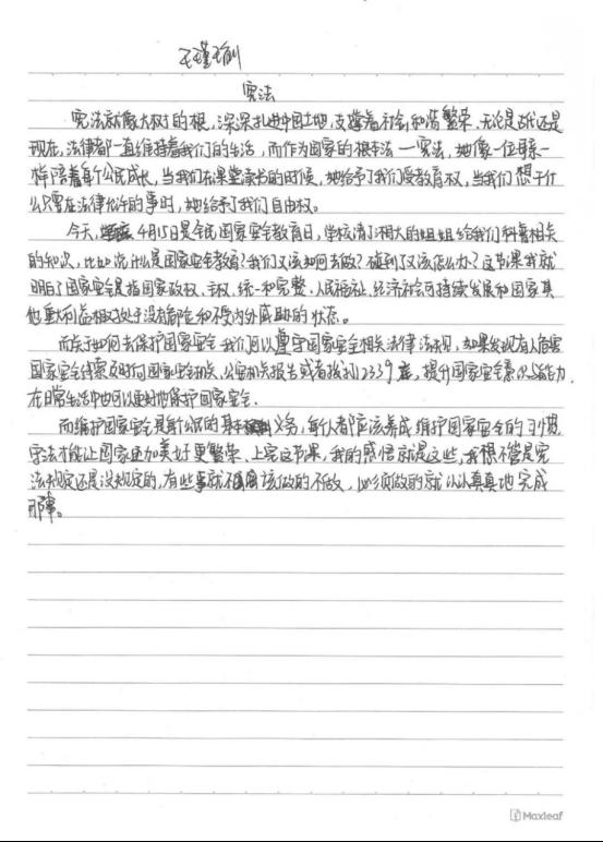 在活动结束之际,同学们纷纷表示,通过这次活动,他们深刻认识到国家安全的重要性,在未来的学习和生活中,他们将会更加自觉地遵守国家的法律法规,提高自己的警觉性,时刻保持对潜在风险的敏感度。他们还表示,每个人都应该成为国家安全的守护者,通过自己的实际行动,为巩固国家安全防线贡献出自己的一份力量,共同维护社会的和谐稳定。活动尾声,同学们踊跃分享学习心得。大家深刻认识到,国家安全并非遥不可及,而是与每个人的日常生活息息相关。他们郑重承诺:今后将自觉遵守法律法规,提升安全防范意识,做国家安全的“小卫士”;从身边小事做起,如谨慎处理网络信息、保护国家机密等,用实际行动筑牢国家安全防线,为维护社会和谐稳定贡献青春力量。