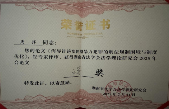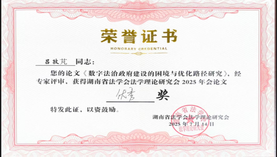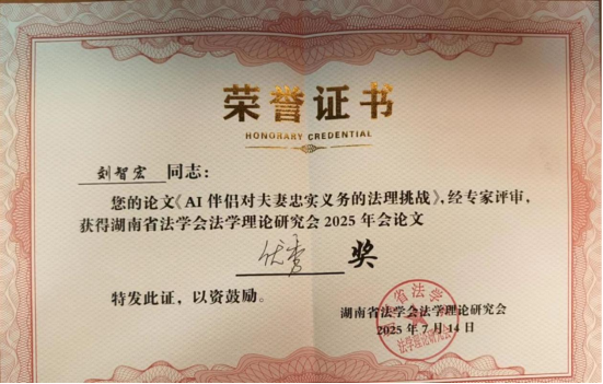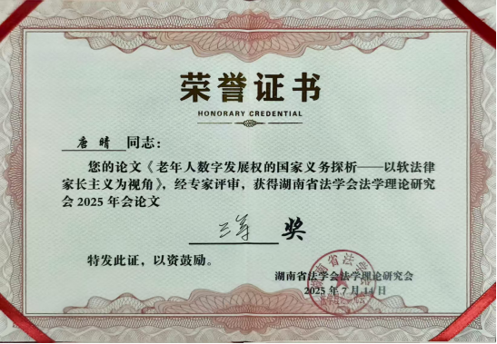 bevictor伟德官网2023级硕士研究生吕孜芃,2024级硕士研究生唐晴、周洋和刘智宏应邀参会。吕孜芃、唐晴、周洋和刘智宏分别撰写的《数字法治政府建设的困境与优化路径研究》《老年人数字发展权的国家义务探析—以软法律家长主义为视角》《侮辱诽谤型网络暴力犯罪的刑法规制困境与制度优化》《AI伴侣对夫妻忠实义务的法理挑战》,经组委会多轮匿名评审,成功入选会议论文集,唐晴和周洋的论文获三等奖,刘智宏和吕孜芃的论文获优秀奖。
