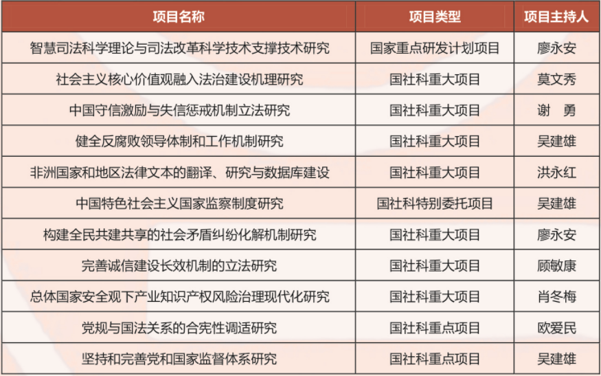 对接国家重大战略需求,凝炼出多元化纠纷解决、非洲法、智慧司法与数据治理、党内法规、纪检监察等特色学科方向,取得丰硕成果:一是近年来承担一批国家级、省部级课题,总经费超3000万元。二是出版“调解”系列教材、《中国共产党党内法规总论》《监察法学》《非洲法导论》等一批具有较大影响力的教材、著作。三是在《求是》《中国法学》《新华文摘》等权威刊物发表系列论文,相关成果多次获湖南省哲学社会科学优秀成果一等奖、全国检察理论研究成果一等奖等奖项。四是有关调解、疫情防控、非洲法等智库成果获得党和国家领导人的肯定性批示。