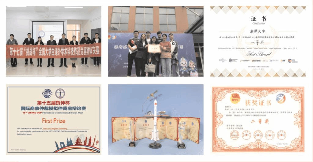学院以培养卓越法治人才为目标,探索出以“模拟体验、理论体验、实践体验”三大模块为内核的体验式教学法。聘请来自立法、司法、行政、纪检监察和法律服务等一线领域的精英参与课程教学,全力推行“实务精英+”教学改革。先后荣获国家教学成果奖二等奖2项、湖南省教学成果奖一等奖7项。建成1门国家级课程思政示范课程、2门国家级一流本科课程、12门省级一流本科课程,人才培养质量在第四轮学科评估中位居全国第13名。培养出教育部“长江学者”特聘教授、全国十大杰出青年法学家等一批知名学者,涌现出 300 余名法院院长、检察院检察长以及一批全国审判业务专家、全国检察业务专家、全国优秀律师。院友周春梅以生命捍卫公平正义,被评为“全国模范法官”“全国三八红旗手”。2017年,创办了“李步云法学卓越班”,研究生升学率达80%左右,着力打造湘大法学人才培养新标杆。在全国大学生模拟法庭竞赛、全国“挑战杯”、全国高校法庭辩论赛、国际空间法模拟法庭竞赛、国际刑事法庭模拟大赛以及“贸仲杯”国际商事仲裁大赛等学科竞赛上,共获得全国性赛事奖项23项,其中一等奖9项。2人被共青团中央和全国学联授予“中国大学生自强之星”荣誉称号,2个班级获评“全国先进班集体”,1个团队获评大学生“三下乡”国家级优秀团队,1个学生社团获评全国高校十佳社团、湖南省最具影响力法治集体。