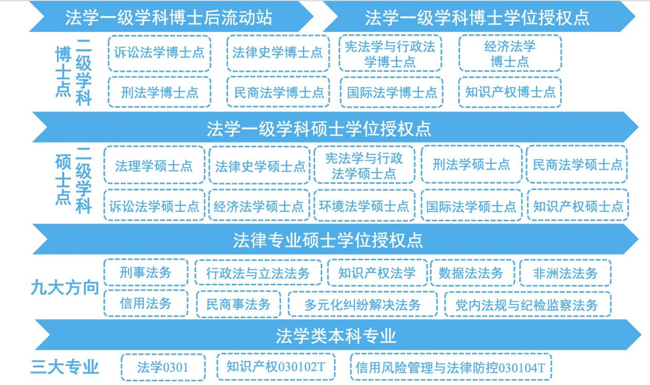 法学楼(法学楼)建筑面积达1.4万平方米,拥有多功能国际会议报告厅、模拟法庭、刑事侦查实验室、调解谈判实验室、大数据智慧司法实验室、同声传译教研室、虚拟仿真实验室、电子阅览室等一应俱全,涵盖了从本科到博士培养的全套教学场所,为人才的实战化培养提供了有力支撑,智慧教室等可以同步连线全国各地高校,实现法学教学线上联动。法律图书馆约1000平方米,中外文藏书逾10万册,其中港台书刊10000多册,外文原版书籍3000多册,报刊近300种。拥有WESTLAW、Heinonline和Kluwer三大法学外文数据库及“国家法规数据库”“法学家-中国法学教学案例全库”“法信”等法学中文数据库。