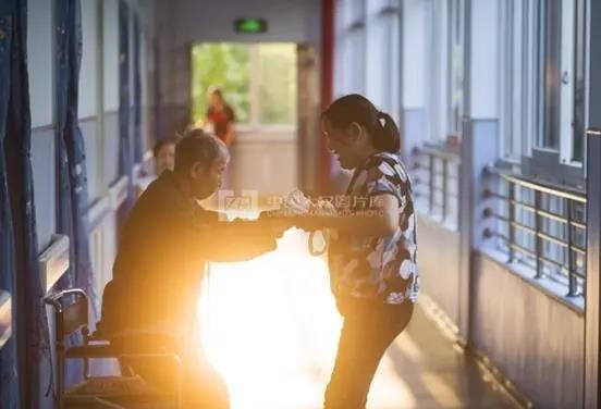 图二:截至2017年,2614.7万城乡残疾人参加城乡社会养老保险,运动疗法等29项医疗康复项目纳入基本医疗保险支付范围,中国残疾人社会保障权得到有效落实。图为湖南长沙市精神病医院护工桂学珍教一位失智老人站起来。