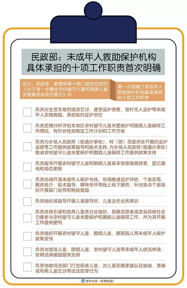 在27日举行的民政部新闻发布会上,民政部儿童福利司副司长倪春霞介绍,近日,民政部、教育部等十部门联合印发的《关于进一步健全农村留守儿童和困境儿童关爱服务体系的意见》中,第一次明确了未成年人救助保护机构具体承担的十项工作职责。