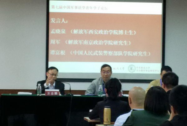 本次论坛共分为四个研讨专题,分别为:“军事法基础理论与基本制度”、“军事法律制度发展与军事司法制度改革”、“国际战争法、武装冲突与国际反恐”、“国家战略利益与国际军事关系”。论坛发言人主要为致力于军事法研究的青年学子,我院万志鹏副教授应邀主持了“军事法基础理论与基本制度”的专题研讨会,并在闭幕式上就该专题研讨成果做了精彩总结发言。研究生唐基韵提交的论文——《美国在韩部署萨德系统的国际法分析》入选专题研讨,并就该论文作了专题研讨发言。在会议期间,各位发言人、点评人还与现场的各位与会人员进行了深入的交流互动。专题研讨结束后,武警政治学院的周健教授做了精彩的学术总结。