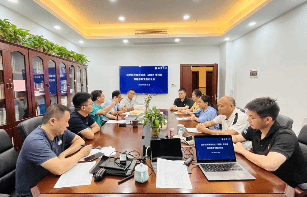 2023年6月28日晚,民事诉讼法(调解)学科组在法学楼310召开课程思政专题研讨会。学科组成员廖永安、王国征、张立平、李喜莲、覃斌武、黄艳好、张庆霖、郑令晗、夏先华、段明、龙乙方等老师参加会议。会议由张立平教授主持。