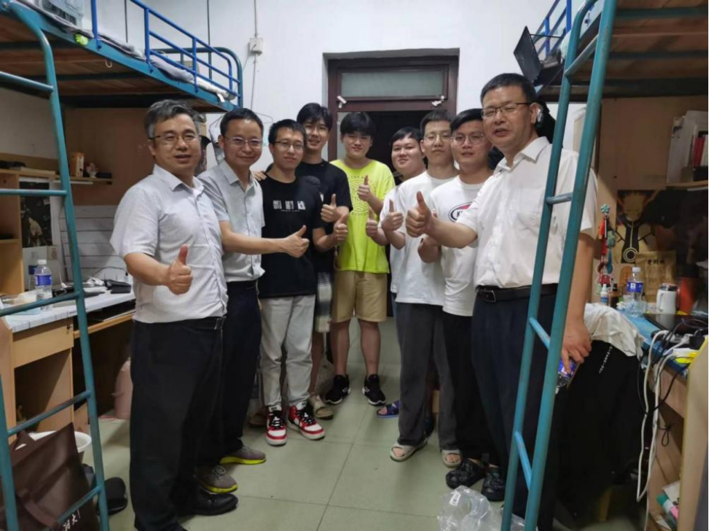 图为 法学院院长欧爱民 、法学院党委书记陈双喜、法学院党委副书记黎益君走访毕业生寝室时在琴湖10栋311寝室合影