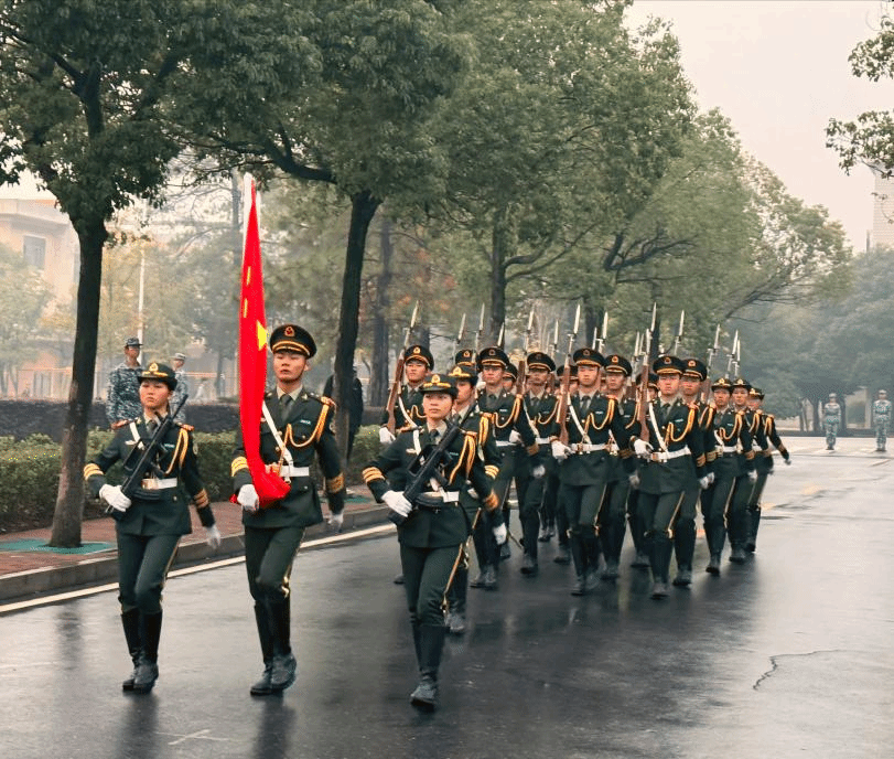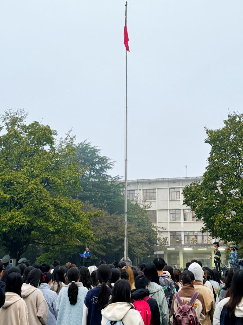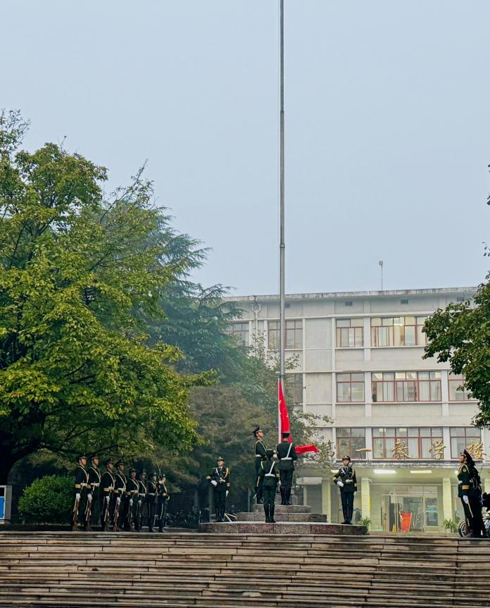 随着一声响亮的“齐步走”,旗手们昂首挺胸,步履铿锵,护着国旗走向升旗台。在他们的身后,是初升朝阳洒下的光辉,映照出他们挺拔的身影,这身影承载着全体同学对国旗、对国家的崇高敬意。
