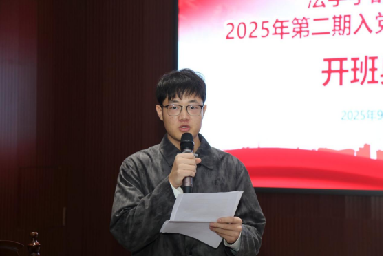 2024 级非洲法方向研究生吴江龙作为参训学员代表发言。他结合自身专业学习与实践经历,生动讲述了党组织在思想引领、价值塑造方面对自己的深刻感召 —— 从参与基层法治宣传实践,到见证党领导下的法治中国建设成就,逐步坚定了 “跟党走、践初心” 的理想信念。并表示一定会珍惜党校学习机会,通过学习全方面提升自己,以实际行动向党组织靠拢。