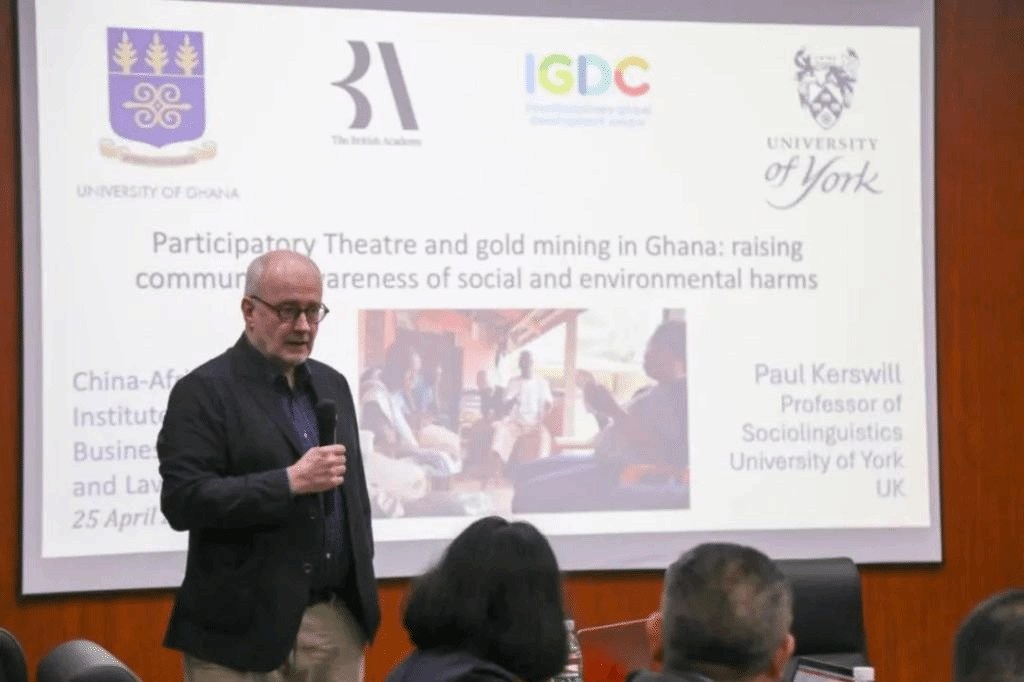 柯斯威尔院士介绍了加纳的金矿开采对当地环境的破坏。他指出加纳是当前非洲最大的黄金生产国,2000年开始,加纳金矿开采出现了大规模扩张,现阶段大部分黄金都是由公司开采,但小规模采矿也在增加。然而,大规模的金矿开采活动对当地环境造成了极大危害。随后,柯斯威尔院士结合自身赴非洲开展田野调查和研究的经历,介绍了解决加纳当地社区环境保护问题的有效方法,即“参与式剧场”。他指出,通过参与式剧场,当地社区可更深入地了解开采活动对加纳社会和生态环境造成的影响,从而提高对环境危害的认识,促使相关群体采取相应行动,通过环境保护法律,积极维护生态环境,确保自然资源可持续性开发与利用。